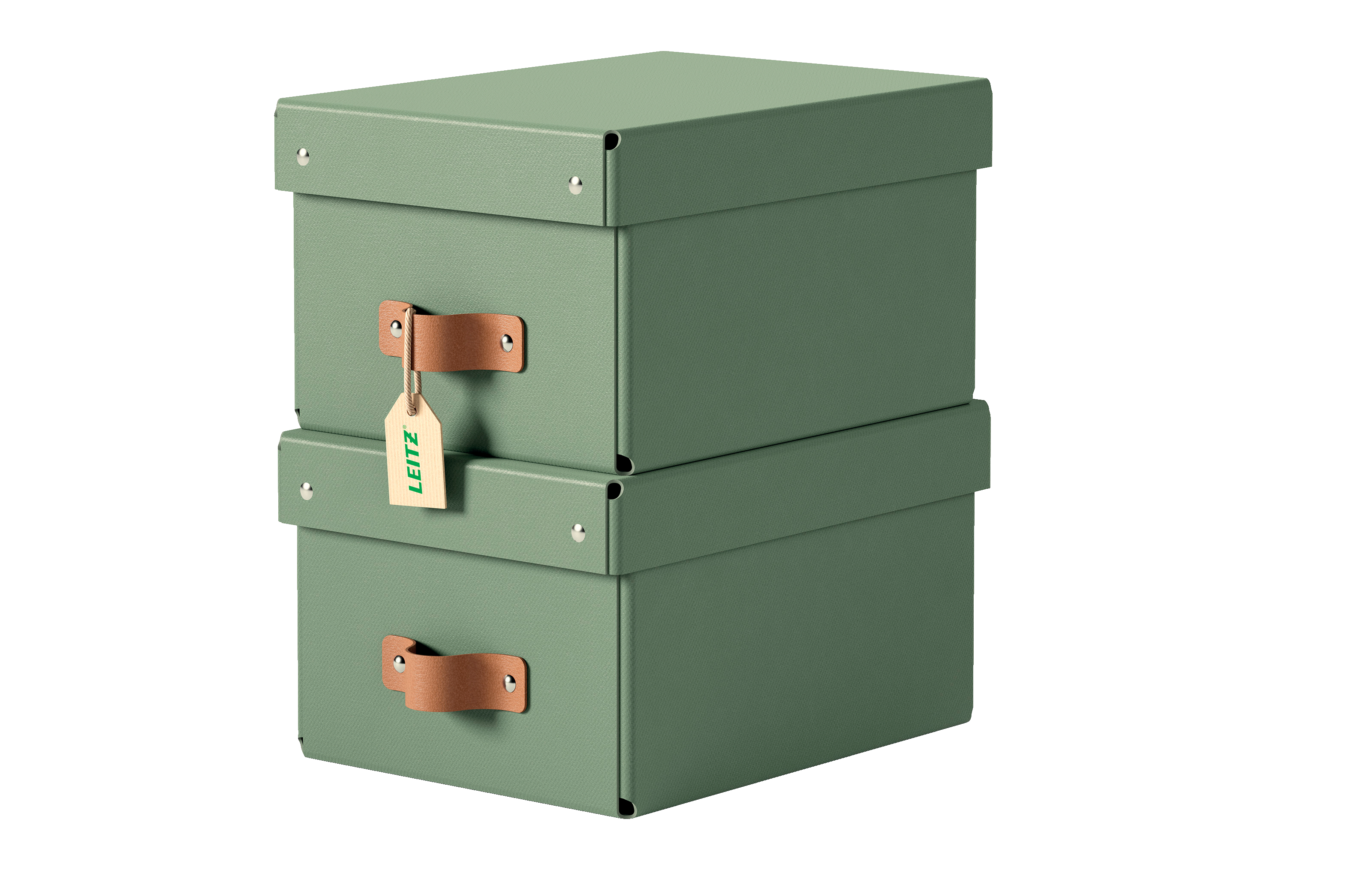 Leitz Puro Aufbewahrungsbox mit Deckel, klein, 6,5L, 100% Recyclingkarton, 2er-Pack · Ordnung halten und sich wohlfühlen - mit den kleinen Leitz Puro Aufbewahrungsboxen aus Karton mit Deckel schaffen Sie sofortigen Stauraum und befreien Ihre Räume von Unordnung. Dieses Set aus zwei dekorativen Aufbewahrungsboxen mit einem Fassungsvermögen von 6,5 Litern sorgt für Ordnung in Ihrem Zuhause und Ihrem Büro und verleiht Ihrer Aufbewahrung Stil. Die hochwertigen Boxen lassen sich platzsparend stapeln und sind ideal für die Aufbewahrung von A5-Dokumenten bis hin zu kleinen Elektronikgeräten, CD/DVDs, Spielzeug und mehr. Diese Leitz Boxen werden flach verpackt geliefert und sind schnell und einfach ohne Werkzeug zu montieren. Diese umweltfreundliche Aufbewahrung besteht zu 100 % aus recyceltem FSC-zertifiziertem Karton und kann nach Gebrauch vollständig zerlegt und zu 100 % recycelt werden. Die Auswahl an erdigen Farben - inspiriert von der Reinheit und Schlichtheit der Natur - wird Ihre Einrichtung perfekt ergänzen und ein Gefühl der Ruhe in Ihre Räume und Büros bringen. Jede kleine Leitz Aufbewahrungsbox ist mit einem ledernen Griff ausgestattet, der das einfache Herausnehmen aus Regalen und Schränken ermöglicht. Hergestellt in Italien. Feel Good mit Leitz. · Set aus zwei Aufbewahrungsboxen aus Karton mit Deckel. 6.5L. Leicht zu montierende kleine Aufbewahrungsbox für A5-Dokumente und andere Gegenstände. 100% recycelter Karton. · Set aus zwei kleinen Aufbewahrungsboxen mit Deckel aus 100% recyceltem, FSC-zertifiziertem Karton in modernem und schlichtem Design, das Ihr Zuhause und Büro ergänzt · Vielseitiger Stauraum mit einem Fassungsvermögen von 6,5 Litern, ideal für die Aufbewahrung von A5-Dokumenten, Hobby- und Bastelbedarf, Spielzeug, kleinen elektronischen Geräten und CDs/DVDs, die leicht zugänglich sind · Starkes und haltbares Material ermöglicht sicheres und platzsparendes Stapeln der Boxen während der Aufbewahrung. · Erhältlich in einer Auswahl an ruhigen, erdigen Farben mit matter Oberfläche, die Sie kombinieren können, um einen modernen und organisierten Raum zu schaffen · Dank des eleganten Ledergriffs lassen sich die Aufbewahrungsboxen aus Karton leicht aus Regalen, Schränken, oder Garderoben entnehmen · Passt perfekt in kubische Möbel, auf Ablageflächen, in die meisten Standard-Schubladen und kann als Aufbewahrung unter dem Bett verwendet werden · Wird flach verpackt in einer plastikfreien Verpackung geliefert und lässt sich einfach und ohne Werkzeug montieren · Kann zu 100 % recycelt werden, indem die Aufbewahrungsboxen einfach in einzelne Teile zerlegt werden · Hochwertige stapelbare Aufbewahrungsboxen, Made in Italy · FEEL GOOD mit Leitz ·