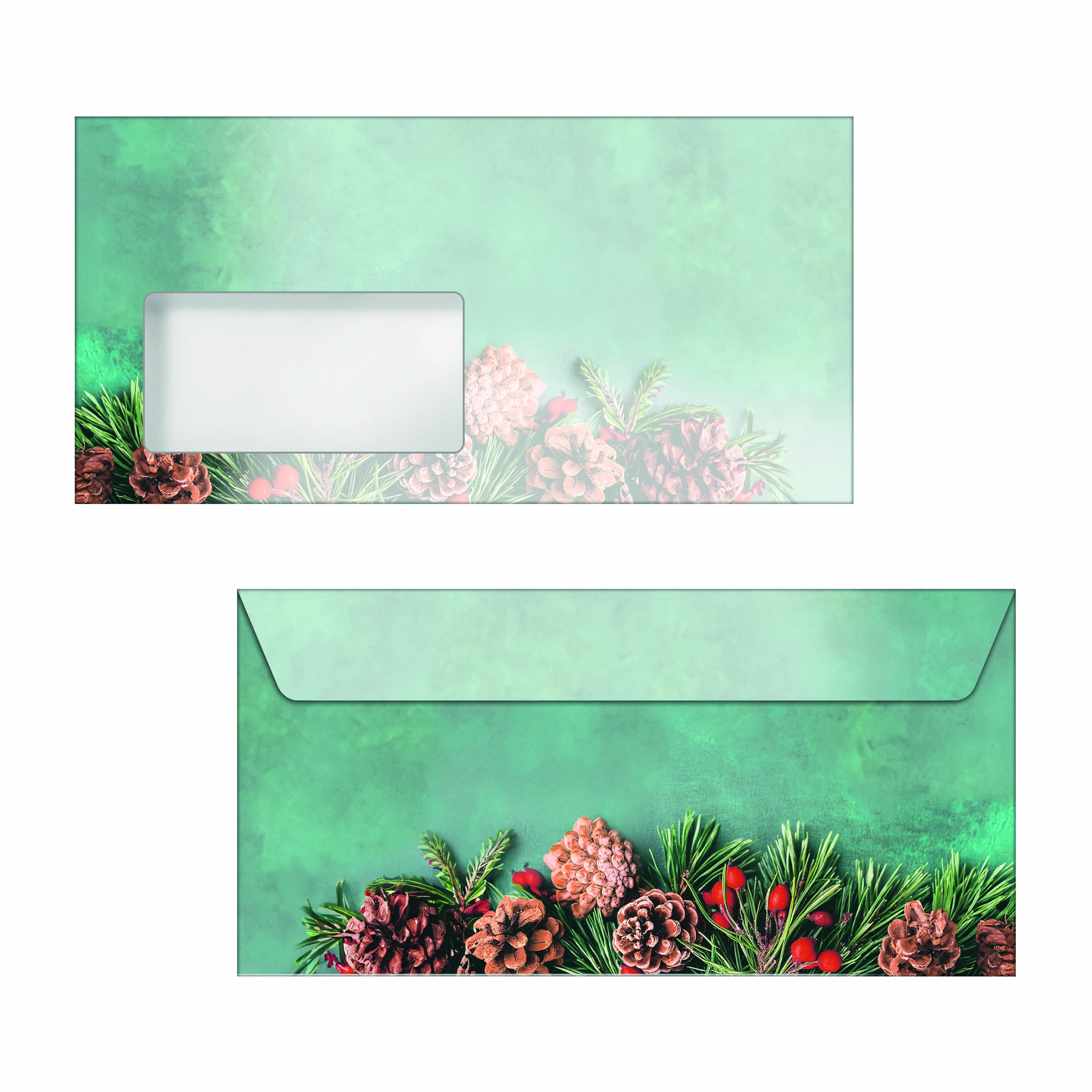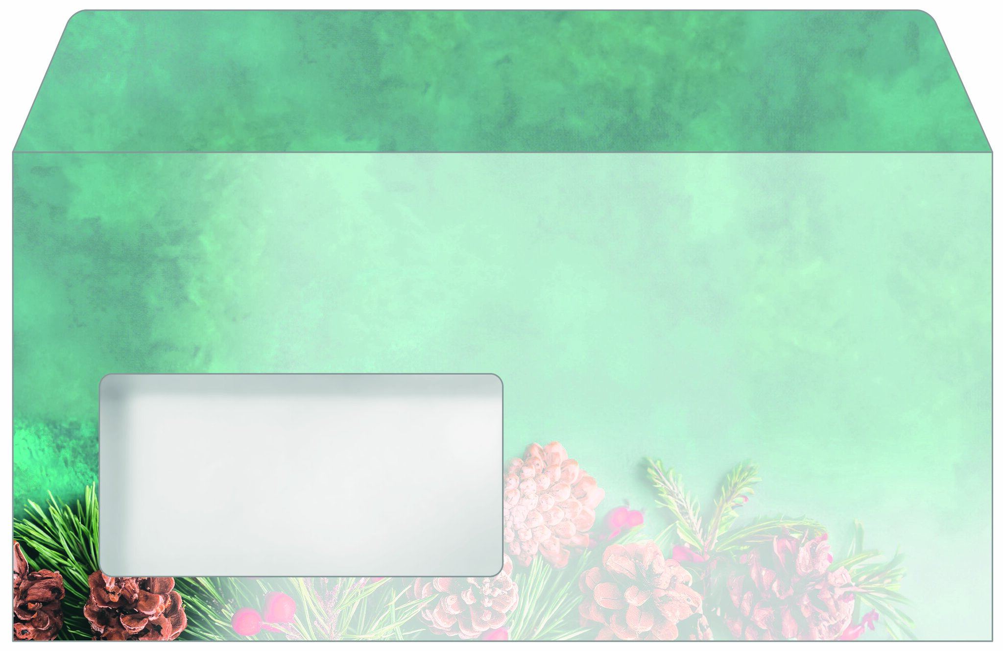 Für besondere Weihnachtsgrüße, die bereits im Briefkasten auffallen. Stilvolle Weihnachtsumschläge "Green Christmas" (Motiv: Tannenzweige in grün/braun/rot) im Format DIN lang, 50 Stück mit gummierter Klappe. Ihre Produktvorteile:Made in EUStimmungsvolles Design, ansprechend und modernFSC-zertifiziert: hochwertiges, umweltfreundliches Papier aus verantwortungsvollen QuellenPraktisches Fenster: kein eigenes Adressetikett bzw. keine zusätzliche Beschriftung nötigMit Innendruck zur Verhinderung der DurchsichtÜberraschen Sie Geschäftspartner, Mitarbeiter, Kollegen oder auch Freunde und Familie mit exklusiven Grüßen zur Weihnachtszeit. Individuell und unkompliziert bedruckbar - für Ihre persönliche und einzigartige Weihnachtspost im Handumdrehen. Keine Abhängigkeit von Druckereien, geringe Auflagen ganz nach Bedarf - und das in Premiumqualität. Lieferumfang: 1x Weihnachts-Umschlag DU642, 50 Stück