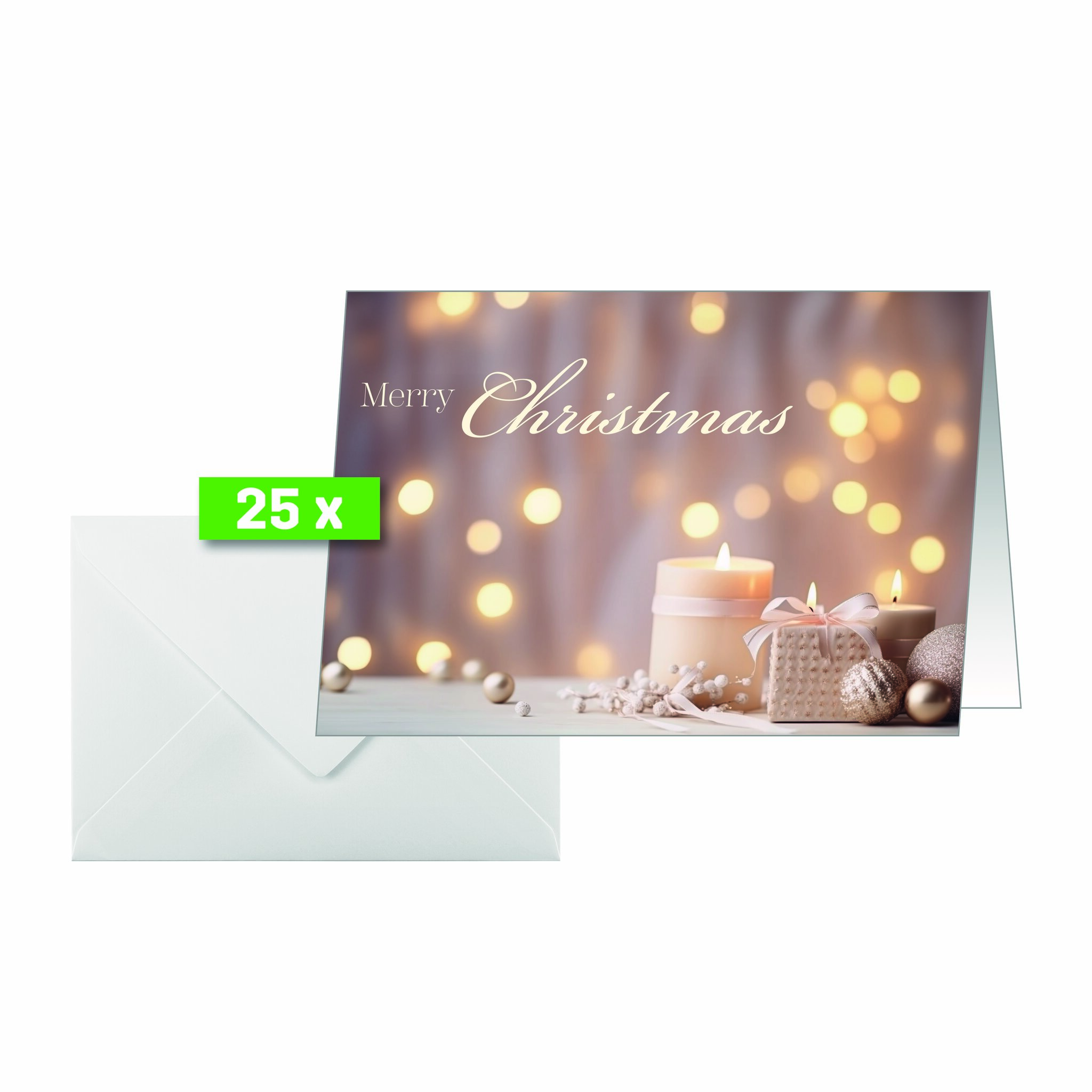 Für besondere Weihnachtsgrüße, die Sie individuell bedrucken und beschriften können. Mit einmaligem Motiv und ruck-zuck bedruckt: Weihnachts-Karten "Golden Glow" (Motiv: Kerzen in gold/beige/champagne) im Format A6 (250 g/m², 25 Karten, Karte: Weißkarton | Umschlag: Weißpapier). Ihre Produktvorteile:Made in GermanyStimmungsvolles Design, ansprechend und modernFSC-zertifiziert: hochwertiges, umweltfreundliches Papier aus verantwortungsvollen QuellenFür alle Inkjet-, Laser-Drucker und Kopierer geeignet, einfach zu gestalten mit der SIGEL Wordvorlage (Download auf Hersteller-Website) oder per Hand beschriftbarKlappkarten für Ihre Weihnachtspost, als Einladung oder Weihnachtsmenü-KarteÜberraschen Sie Geschäftspartner, Mitarbeiter, Kollegen oder auch Freunde und Familie mit exklusiven Grüßen zur Weihnachtszeit. Individuell und unkompliziert bedruckbar - für Ihre persönliche und einzigartige Weihnachtspost im Handumdrehen. Keine Abhängigkeit von Druckereien, geringe Auflagen ganz nach Bedarf - und das in Premiumqualität. Lieferumfang: 1x Weihnachts-Karten DS634, 25 Karten, inkl. Umschläge