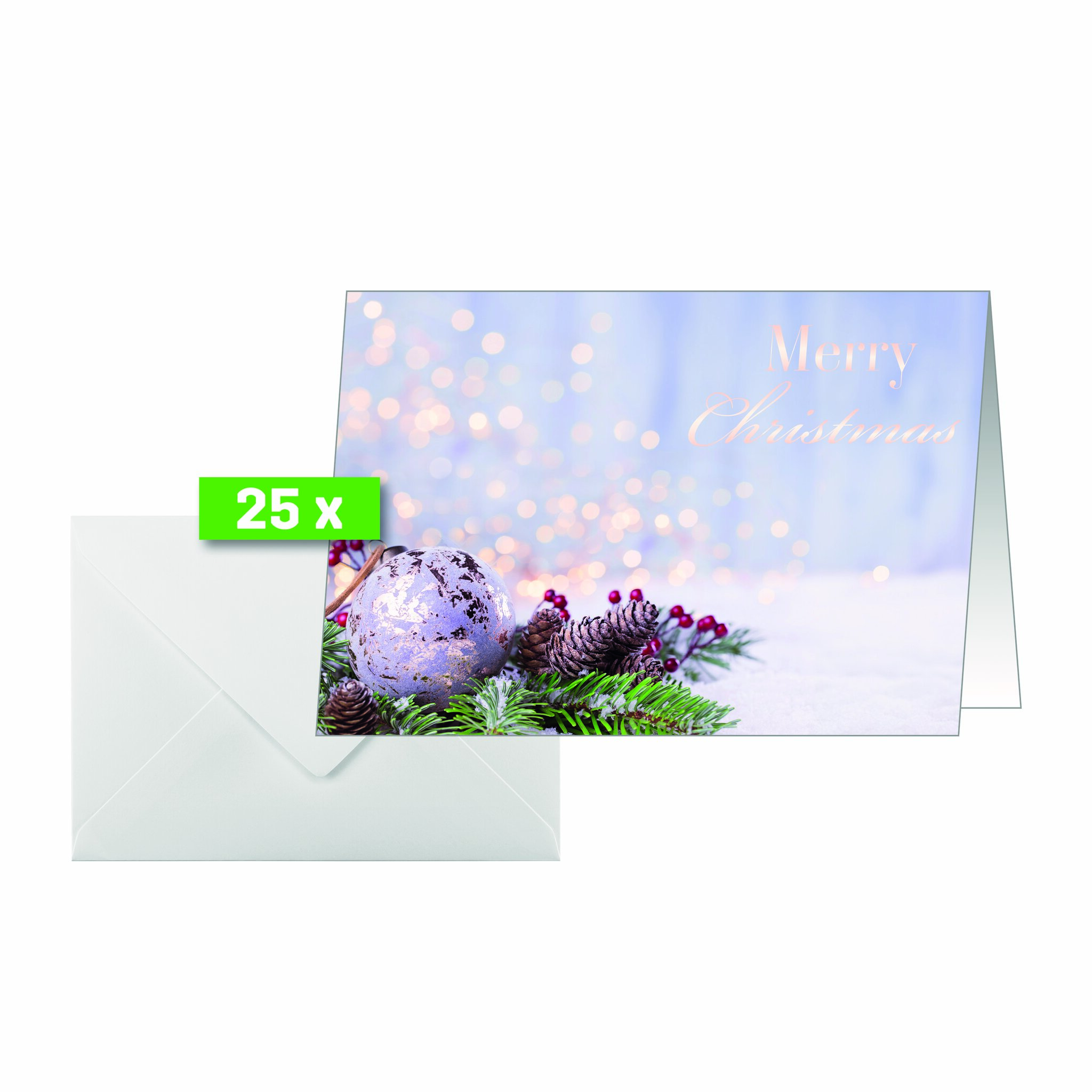 Für besondere Weihnachtsgrüße, die Sie individuell bedrucken und beschriften können. Mit einmaligem Motiv und ruck-zuck bedruckt: Weihnachts-Karten "Charmful Christmas" (Motiv: Weihnachtskugel in lila/grün) im Format A6 (250 g/m², 25 Karten, Karte: Weißkarton | Umschlag: Weißpapier). Ihre Produktvorteile:Made in GermanyStimmungsvolles Design, ansprechend und modernFSC-zertifiziert: hochwertiges, umweltfreundliches Papier aus verantwortungsvollen QuellenFür alle Inkjet-, Laser-Drucker und Kopierer geeignet, einfach zu gestalten mit der SIGEL Wordvorlage (Download auf Hersteller-Website) oder per Hand beschriftbarKlappkarten für Ihre Weihnachtspost, als Einladung oder Weihnachtsmenü-KarteÜberraschen Sie Geschäftspartner, Mitarbeiter, Kollegen oder auch Freunde und Familie mit exklusiven Grüßen zur Weihnachtszeit. Individuell und unkompliziert bedruckbar - für Ihre persönliche und einzigartige Weihnachtspost im Handumdrehen. Keine Abhängigkeit von Druckereien, geringe Auflagen ganz nach Bedarf - und das in Premiumqualität. Lieferumfang: 1x Weihnachts-Karten DS443, 25 Karten, inkl. Umschläge