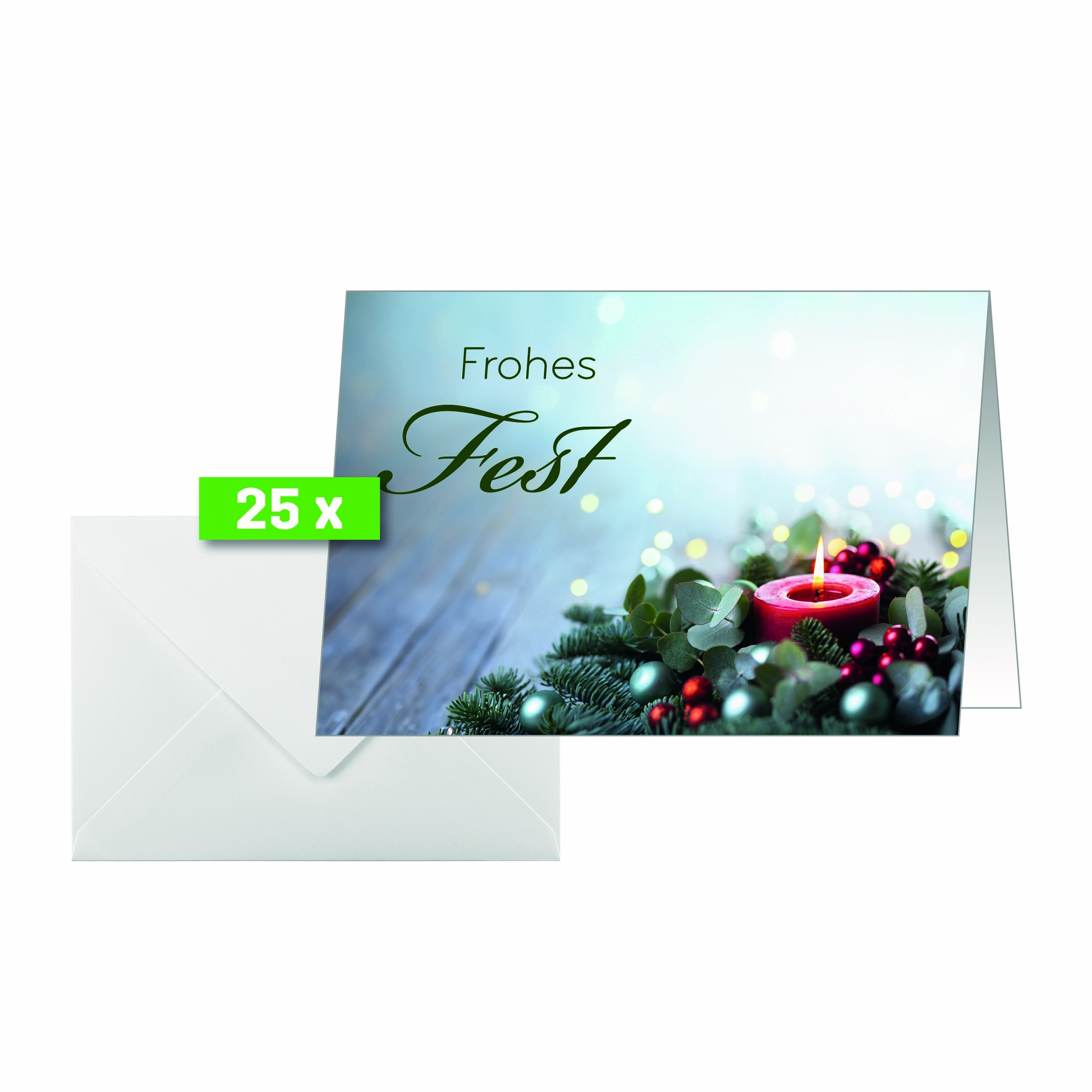 Für besondere Weihnachtsgrüße, die Sie individuell bedrucken und beschriften können. Mit einmaligem Motiv und ruck-zuck bedruckt: Weihnachts-Karten "Candlelight Cheer" (Motiv: Kerze in grün/rot) im Format A6 (250 g/m², 25 Karten, Karte: Weißkarton | Umschlag: Weißpapier). Ihre Produktvorteile:Made in GermanyStimmungsvolles Design, ansprechend und modernFSC-zertifiziert: hochwertiges, umweltfreundliches Papier aus verantwortungsvollen QuellenFür alle Inkjet-, Laser-Drucker und Kopierer geeignet, einfach zu gestalten mit der SIGEL Wordvorlage (Download auf Hersteller-Website) oder per Hand beschriftbarKlappkarten für Ihre Weihnachtspost, als Einladung oder Weihnachtsmenü-KarteÜberraschen Sie Geschäftspartner, Mitarbeiter, Kollegen oder auch Freunde und Familie mit exklusiven Grüßen zur Weihnachtszeit. Individuell und unkompliziert bedruckbar - für Ihre persönliche und einzigartige Weihnachtspost im Handumdrehen. Keine Abhängigkeit von Druckereien, geringe Auflagen ganz nach Bedarf - und das in Premiumqualität. Lieferumfang: 1x Weihnachts-Karten DS640, 25 Karten, inkl. Umschläge
