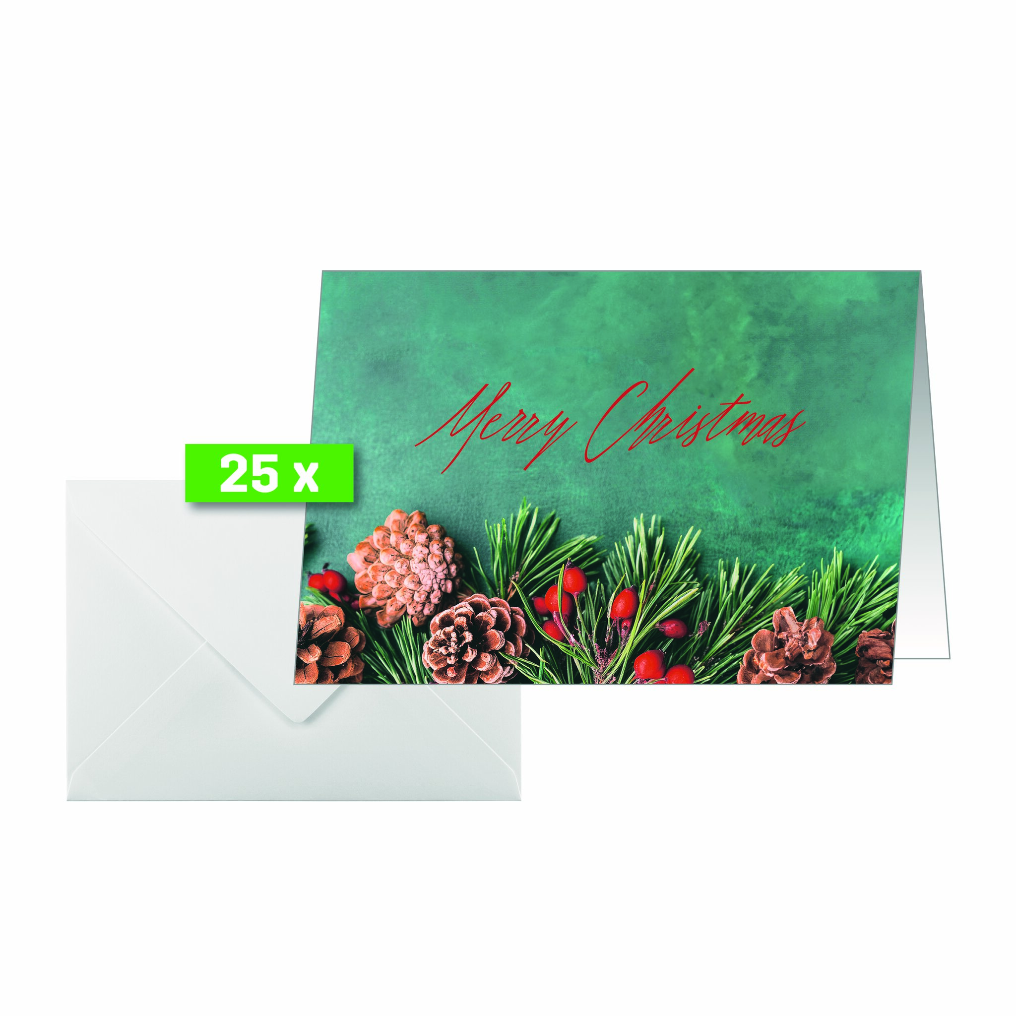 Für besondere Weihnachtsgrüße, die Sie individuell bedrucken und beschriften können. Mit einmaligem Motiv und ruck-zuck bedruckt: Weihnachts-Karten "Green Christmas" (Motiv: Tannenzweige in grün/braun/rot) im Format A6 (250 g/m², 25 Karten, Karte: Weißkarton | Umschlag: Weißpapier). Ihre Produktvorteile:Made in GermanyStimmungsvolles Design, ansprechend und modernFSC-zertifiziert: hochwertiges, umweltfreundliches Papier aus verantwortungsvollen QuellenFür alle Inkjet-, Laser-Drucker und Kopierer geeignet, einfach zu gestalten mit der SIGEL Wordvorlage (Download auf Hersteller-Website) oder per Hand beschriftbarKlappkarten für Ihre Weihnachtspost, als Einladung oder Weihnachtsmenü-KarteÜberraschen Sie Geschäftspartner, Mitarbeiter, Kollegen oder auch Freunde und Familie mit exklusiven Grüßen zur Weihnachtszeit. Individuell und unkompliziert bedruckbar - für Ihre persönliche und einzigartige Weihnachtspost im Handumdrehen. Keine Abhängigkeit von Druckereien, geringe Auflagen ganz nach Bedarf - und das in Premiumqualität. Lieferumfang: 1x Weihnachts-Karten DS642, 25 Karten, inkl. Umschläge