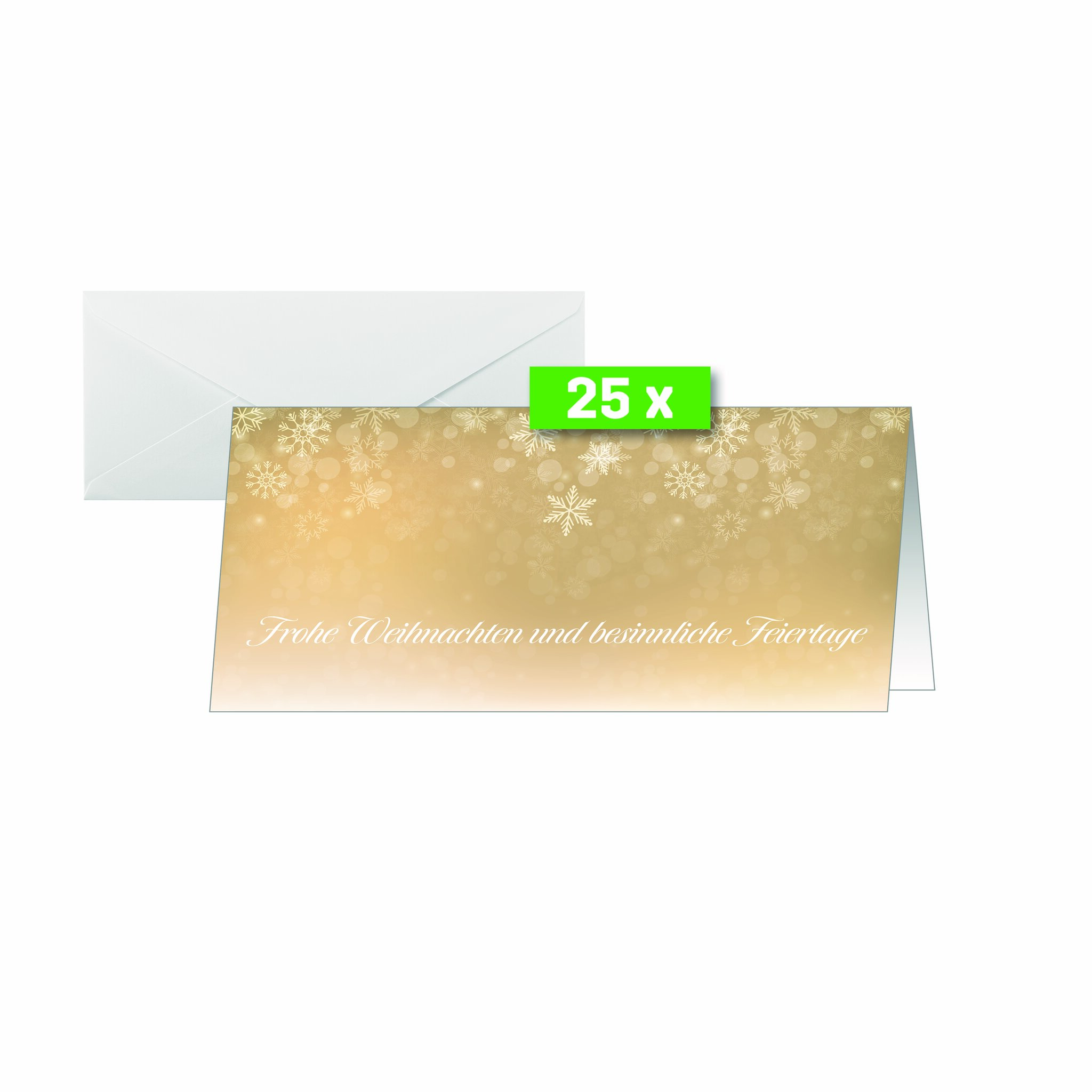 Für besondere Weihnachtsgrüße, die Sie individuell bedrucken und beschriften können. Mit einmaligem Motiv und ruck-zuck bedruckt: Weihnachts-Karten "Golden Christmas Night" (Motiv: Schneeflocken in gold) im Format DIN lang (250 g/m², 25 Karten, Karte: Weißkarton | Umschlag: Weißpapier). Ihre Produktvorteile:Made in GermanyStimmungsvolles Design, ansprechend und modernFSC-zertifiziert: hochwertiges, umweltfreundliches Papier aus verantwortungsvollen QuellenFür alle Inkjet-, Laser-Drucker und Kopierer geeignet, einfach zu gestalten mit der SIGEL Wordvorlage (Download auf Hersteller-Website) oder per Hand beschriftbarKlappkarten für Ihre Weihnachtspost, als Einladung oder Weihnachtsmenü-KarteÜberraschen Sie Geschäftspartner, Mitarbeiter, Kollegen oder auch Freunde und Familie mit exklusiven Grüßen zur Weihnachtszeit. Individuell und unkompliziert bedruckbar - für Ihre persönliche und einzigartige Weihnachtspost im Handumdrehen. Keine Abhängigkeit von Druckereien, geringe Auflagen ganz nach Bedarf - und das in Premiumqualität. Lieferumfang: 1x Weihnachts-Karten DS633, 25 Karten + Umschläge, inkl. Umschläge