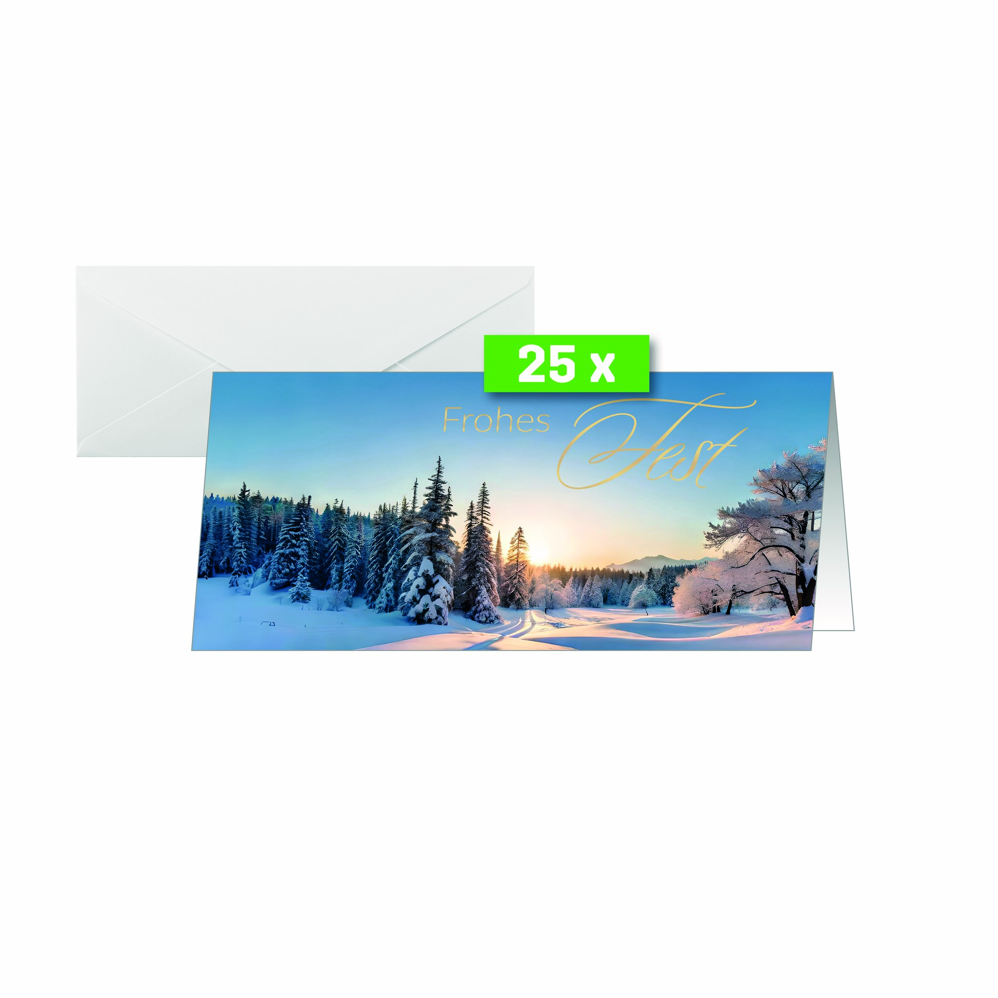 Für besondere Weihnachtsgrüße, die Sie individuell bedrucken und beschriften können. Mit einmaligem Motiv und ruck-zuck bedruckt: Weihnachts-Karten "Winter Wonderland" (Motiv: Winterlandschaft in blau/weiß/gold) im Format DIN lang (250 g/m², 25 Karten, Karte: Weißkarton | Umschlag: Weißpapier). Ihre Produktvorteile:Made in GermanyStimmungsvolles Design, ansprechend und modernFSC-zertifiziert: hochwertiges, umweltfreundliches Papier aus verantwortungsvollen QuellenFür alle Inkjet-, Laser-Drucker und Kopierer geeignet, einfach zu gestalten mit der SIGEL Wordvorlage (Download auf Hersteller-Website) oder per Hand beschriftbarKlappkarten für Ihre Weihnachtspost, als Einladung oder Weihnachtsmenü-KarteÜberraschen Sie Geschäftspartner, Mitarbeiter, Kollegen oder auch Freunde und Familie mit exklusiven Grüßen zur Weihnachtszeit. Individuell und unkompliziert bedruckbar - für Ihre persönliche und einzigartige Weihnachtspost im Handumdrehen. Keine Abhängigkeit von Druckereien, geringe Auflagen ganz nach Bedarf - und das in Premiumqualität. Lieferumfang: 1x Weihnachts-Karten DS638, 25 Karten + Umschläge, inkl. Umschläge