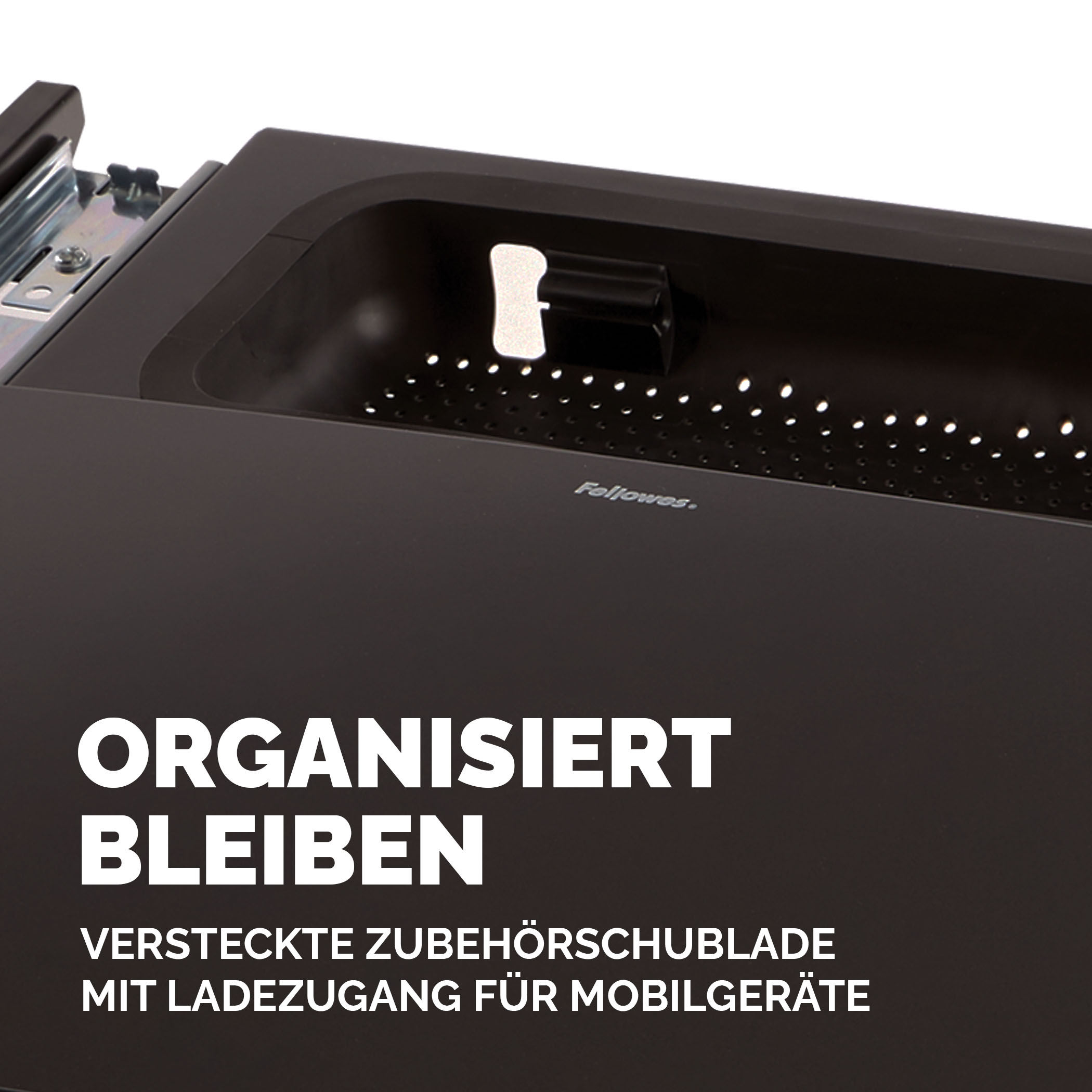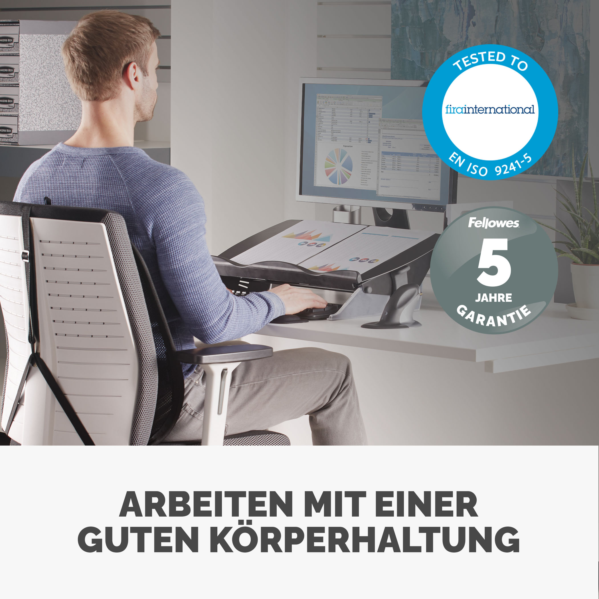 Zur Nutzung zwischen Monitor/Laptop und Tastatur. Plattform gleitet stufenlos nach vorne zur Abdeckung der Tastatur und Schaffung einer ergonomischen Schreibunterlage. Mit herausnehmbarem Zubehörfach.