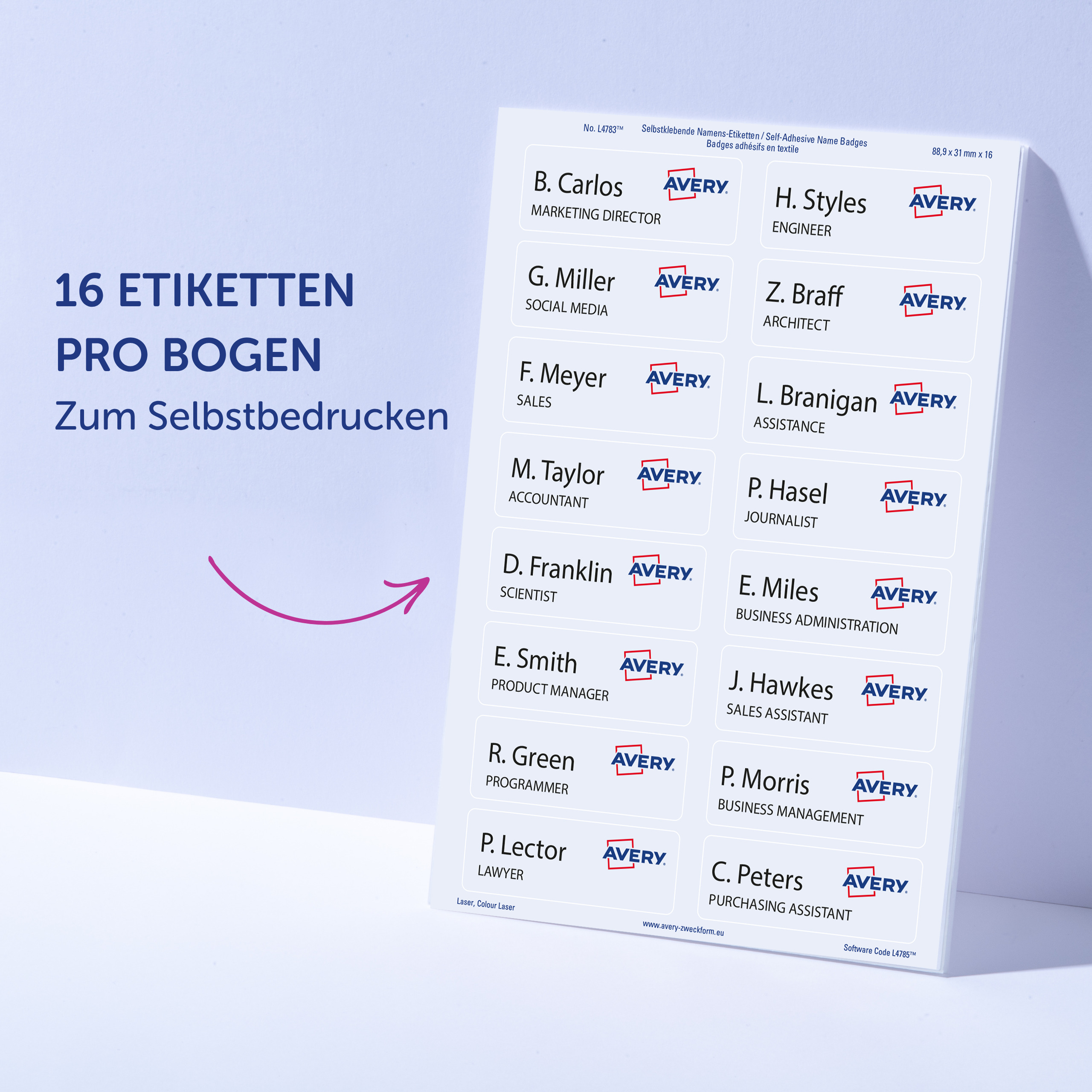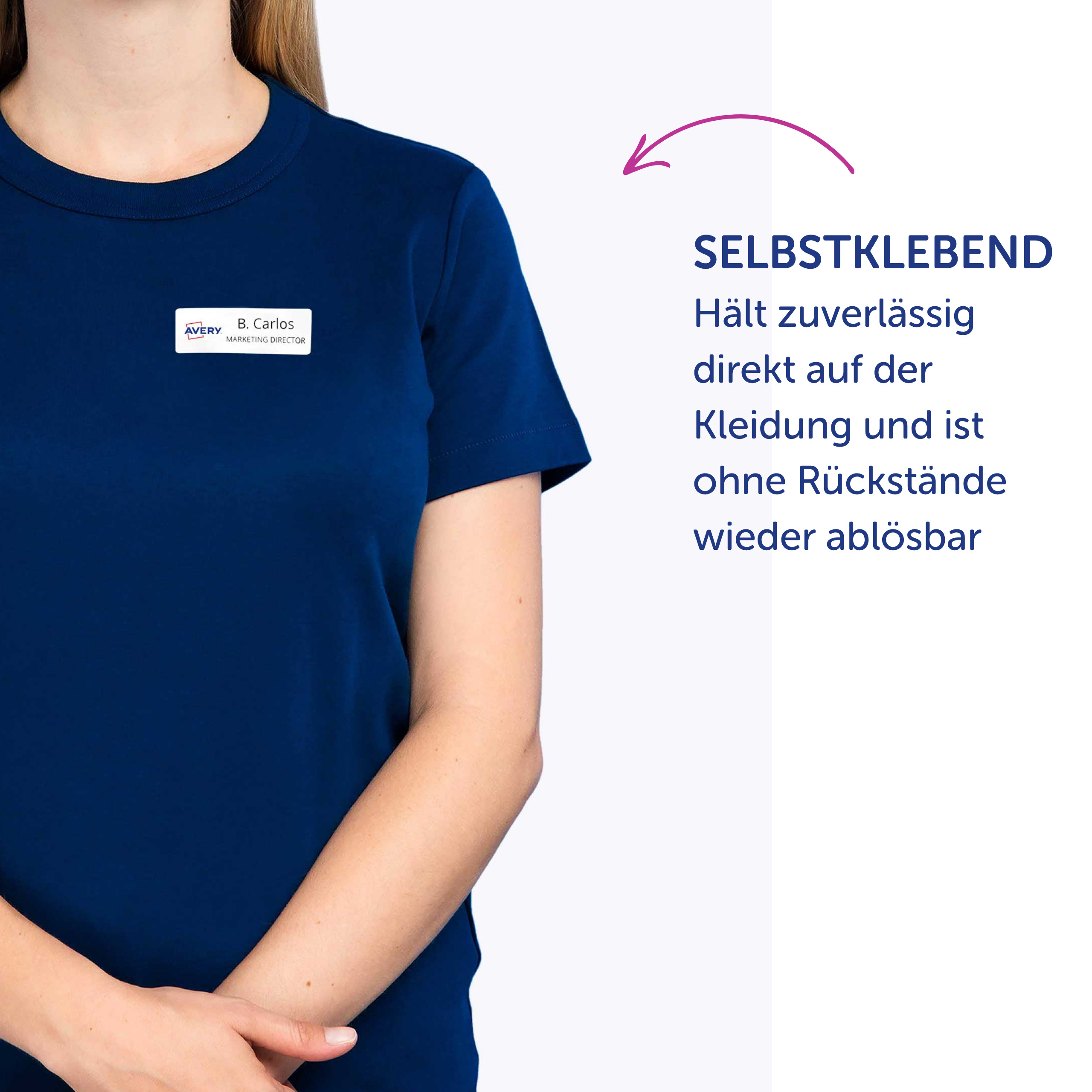 Qualität vom Etiketten-Experten: die selbstklebenden, ablösbaren Namens-Etiketten L4784-20 für Laser-Drucker von Avery Zweckform im Format 63,5 x 29,6 mm erleichtern Ihnen die Organisation von Veranstaltungen, Seminaren und Konferenzen. 540 weiße, bedruckbare Textil-Etiketten auf 20 Bogen. Die rechteckigen Namensschilder sind die perfekte Alternative zu Plastikschildern mit Nadel oder Clip. Die Namensschilder aus Acetatseide haften zuverlässig auf Kleidung und Textilien und lassen sich rückstandsfrei wieder ablösen. Die Rückseiten-Stanzung der Namensschilder erlaubt das einfache Heraustrennen der Namens-Etiketten samt Trägerfolie für eine spätere Verwendung. Die Textil-Etiketten sind nicht geeignet für Leder, Seide, Samt und andere empfindliche Textilien. Die Namens-Etiketten bieten einen garantiert staufreien Druckerdurchlauf auf allen gängigen Laser-Druckern. So arbeiten Sie effizient wie stressfrei und schaffen sich wertvolle Zeit für die wirklich wichtigen Dinge. Ideen drucken - einfach & professionell: mit Etiketten von Avery Zweckform können Sie den kostenlosen Online Etiketten-Designer unter www.avery.eu/print nutzen. Gestalten Sie Ihr Etikett mit der Software komplett selbst, verwenden Sie eine der Design-Vorlagen zu zahlreichen Themen, die Sie individuell anpassen können oder laden Sie Ihr fertiges Design hoch und drucken anschließend standgenau aus. So schnell und einfach sorgen Sie für einen professionellen Auftritt. Think & Care - Avery Zweckform ist seit 2020 klimaneutral: die Treibhausgasemissionen des Standortes werden durch zertifizierte Klimaschutzprojekte ausgeglichen. Schon seit 2014 wird ausschließlich Ökostrom/-gas verwendet. Forschung, Entwicklung, Produktion, Logistik und Verwaltung am Firmenstandort in Oberlaindern/Bayern garantieren höchste Qualitäts- und Umweltstandards sowie kurze Lieferwege. Die Etiketten aus PVC-freier Acetatseide werden klimaneutral hergestellt, die Emissionen des Materials werden kompensiert. Made in Germany.