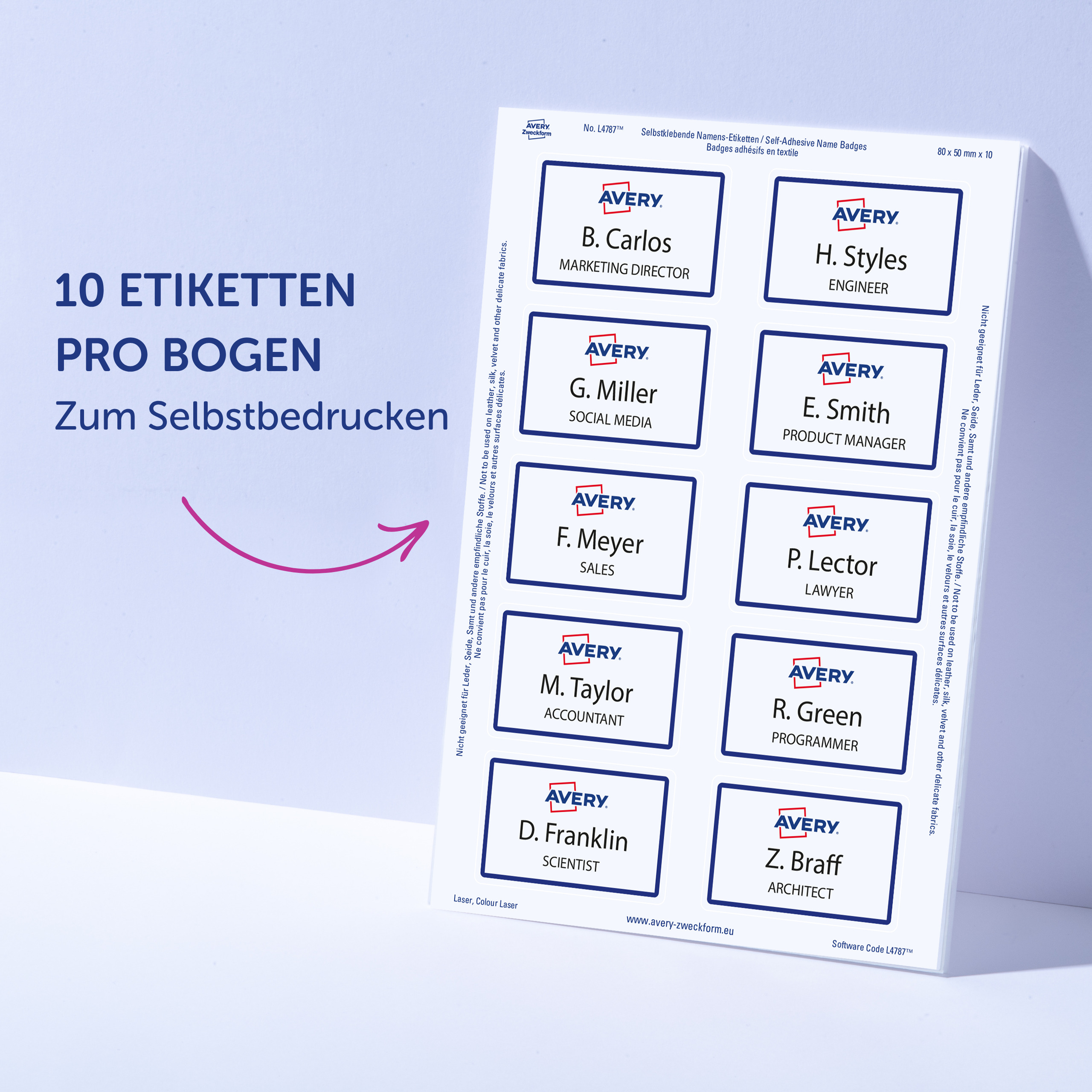 Qualität vom Etiketten-Experten: die selbstklebenden, ablösbaren Namens-Etiketten L4785-20 für Laser-Drucker von Avery Zweckform im Format 80 x 50 mm erleichtern Ihnen die Organisation von Veranstaltungen, Seminaren und Konferenzen. 200 weiße, bedruckbare Textil-Etiketten auf 20 Bogen. Die rechteckigen Namensschilder sind die perfekte Alternative zu Plastikschildern mit Nadel oder Clip. Die Namensschilder aus Acetatseide haften zuverlässig auf Kleidung und Textilien und lassen sich rückstandsfrei wieder ablösen. Die Rückseiten-Stanzung der Namensschilder erlaubt das einfache Heraustrennen der Namens-Etiketten samt Trägerfolie für eine spätere Verwendung. Die Textil-Etiketten sind nicht geeignet für Leder, Seide, Samt und andere empfindliche Textilien. Die Namens-Etiketten bieten einen garantiert staufreien Druckerdurchlauf auf allen gängigen Laser-Druckern. So arbeiten Sie effizient wie stressfrei und schaffen sich wertvolle Zeit für die wirklich wichtigen Dinge. Ideen drucken - einfach & professionell: mit Etiketten von Avery Zweckform können Sie den kostenlosen Online Etiketten-Designer unter www.avery.eu/print nutzen. Gestalten Sie Ihr Etikett mit der Software komplett selbst, verwenden Sie eine der Design-Vorlagen zu zahlreichen Themen, die Sie individuell anpassen können oder laden Sie Ihr fertiges Design hoch und drucken anschließend standgenau aus. So schnell und einfach sorgen Sie für einen professionellen Auftritt. Think & Care - Avery Zweckform ist seit 2020 klimaneutral: die Treibhausgasemissionen des Standortes werden durch zertifizierte Klimaschutzprojekte ausgeglichen. Schon seit 2014 wird ausschließlich Ökostrom/-gas verwendet. Forschung, Entwicklung, Produktion, Logistik und Verwaltung am Firmenstandort in Oberlaindern/Bayern garantieren höchste Qualitäts- und Umweltstandards sowie kurze Lieferwege. Die Etiketten aus PVC-freier Acetatseide werden klimaneutral hergestellt, die Emissionen des Materials werden kompensiert. Made in Germany.