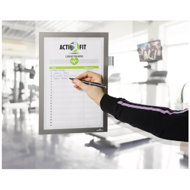 Der Info-Rahmen zum direkten Beschriften. Kann an tragfähige, glatte Oberflächen geklebt und z. B. von Glas wieder entfernt werden. Für Reinigungspläne in Sanitäranlagen, Anmeldungen zu Veranstaltungen etc.. Schnelles Einlegen und einfaches Auswechseln von Dokumenten durch aufklappbaren Magnetrahmen. Direktes Beschriften des Dokumentes ohne extra Aufklappen des Info-Rahmens. Doppelseitige Lesbarkeit an Glasflächen durch 2 Einlagen. Identische Optik des Rahmens von beiden Seiten. Anwendbar im Hoch- und Querformat. Für alle Stifte mit Befestigungsclip.