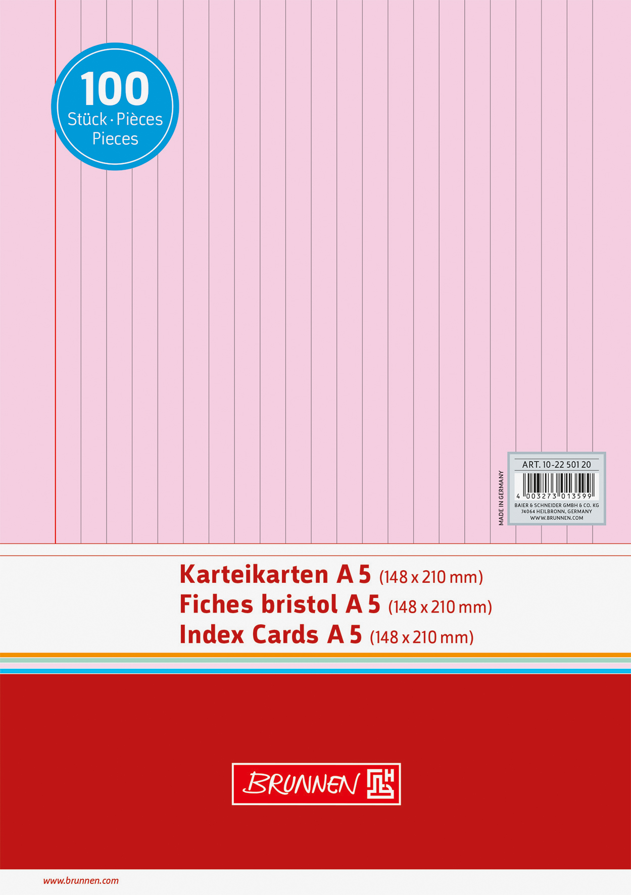 Produktbeschreibung Karteikarten BRUNNEN 22501 A5 liniert rot 100 Stück