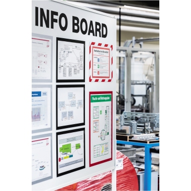 Der Info-Rahmen zur Anwendung an metallischen Oberflächen wie z.B. Whiteboards, Schautafeln oder an Maschinen. Für Dokumente wie z.B. Maschinenakten und Mitarbeiterinformationen. Schnelles und einfaches Auswechseln von Dokumenten durch Magnetrahmen. Anwendbar im Hoch- und Querformat.