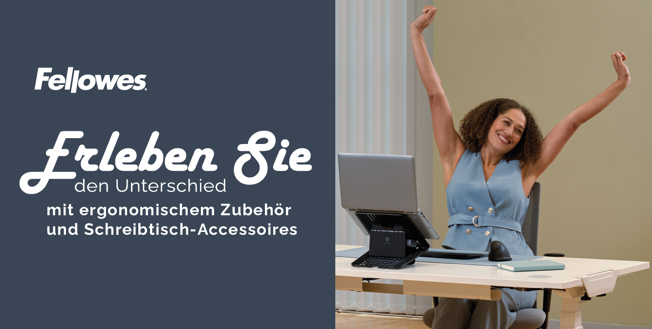 Fellowes entwickelt seit 1917 Lösungen für effiziente, komfortable und zuverlässige Arbeitsplätze – vom Homeoffice bis zum Büro. Als familiengeführtes Unternehmen in vierter Generation steht Fellowes für Kontinuität, Qualität und nutzerorientierte Innovation. „Erleben Sie den Unterschied“ bringt diesen Anspruch auf den Punkt: spürbarer Mehrwert im Arbeitsalltag, klare Funktion und moderne Gestaltung. Das ergonomische Zonen-Konzept von Fellowes™ zeigt, wie typische Belastungen am Arbeitsplatz systematisch identifiziert und mit passenden Lösungen adressiert werden – etwa durch Monitorarme, höhenverstellbare Tische sowie Rücken-/Lenden-, Fuß- und Handgelenkstützen.
