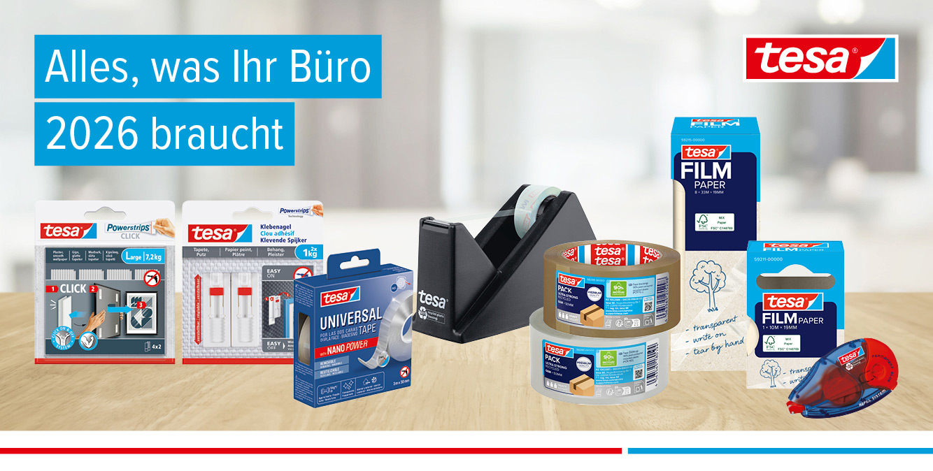 tesa® steht seit Jahrzehnten für hochwertige Klebelösungen, die den Arbeitsalltag einfacher machen. Ob beim Befestigen, Verpacken, Dekorieren oder Reparieren – die Produkte überzeugen durch starke Haftkraft, einfache Anwendung und langlebige Ergebnisse. Von transparenten Klebefilmen über doppelseitige Klebebänder bis hin zu praktischen Befestigungssystemen bietet tesa® Klebelösungen, die zuverlässig haften und bei vielen unterschiedliche Aufgaben im Büro und Alltag überzeugen.