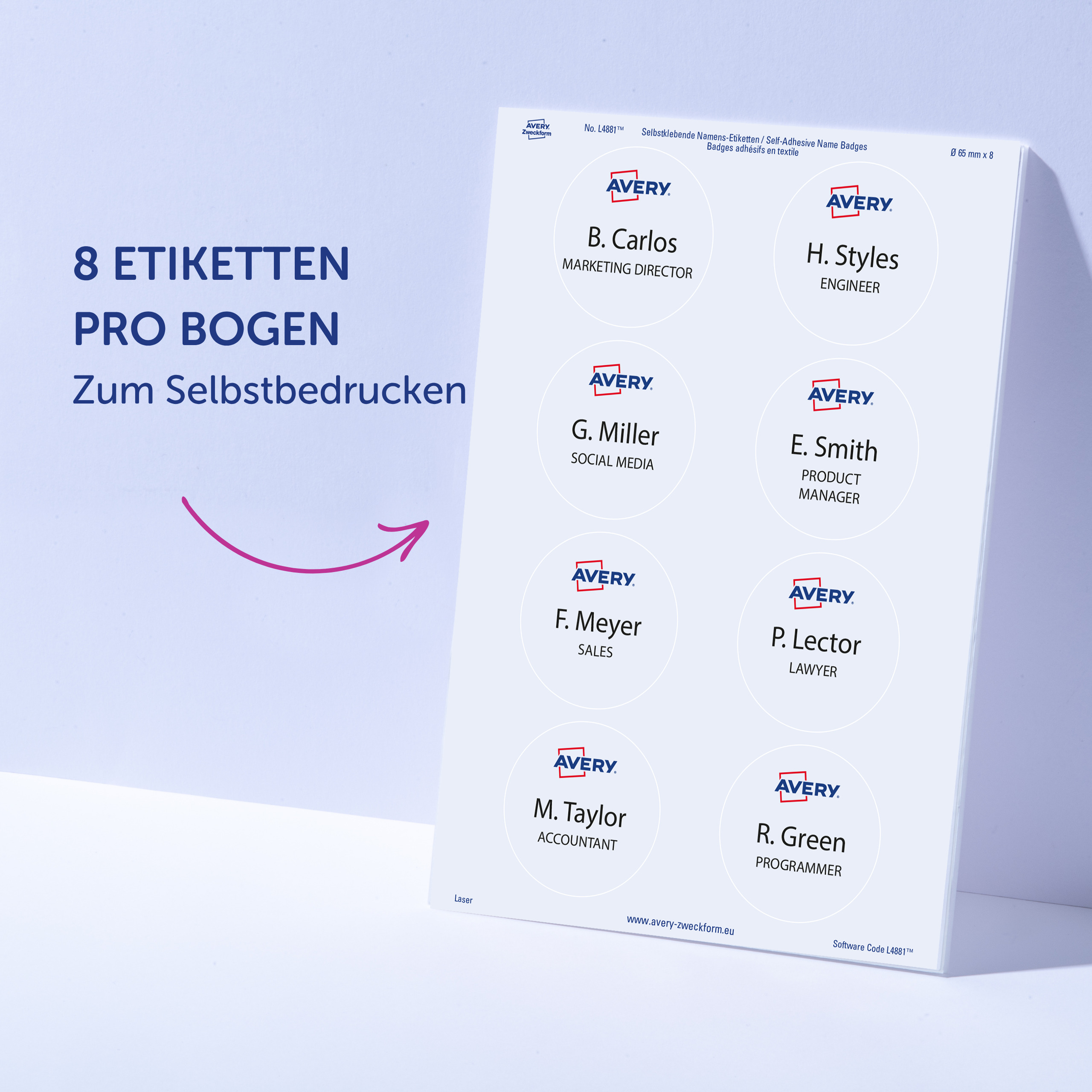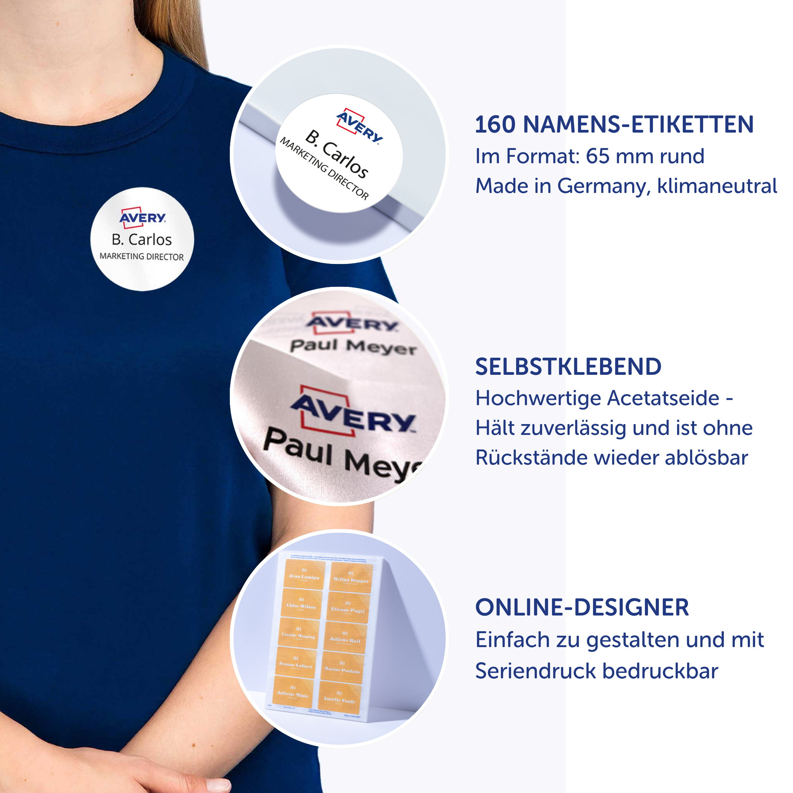Qualität vom Etiketten-Experten: die selbstklebenden, ablösbaren Namens-Etiketten L4882-20 für Laser-Drucker von Avery Zweckform im ovalen Format 85 x 50 mm erleichtern Ihnen die Organisation von Veranstaltungen, Seminaren, Messen und Konferenzen. 200 weiße, bedruckbare Textil-Etiketten auf 20 Bogen. Die ovalen Namens-Etiketten sind die perfekte Alternative zu Plastikschildern mit Nadel oder Clip. Die Namensschilder aus Acetatseide haften zuverlässig auf Kleidung und Textilien und lassen sich rückstandsfrei wieder ablösen. Die Rückseiten-Stanzung des Namensschilds erlaubt das Heraustrennen des Namens-Etiketts samt Trägerfolie für eine spätere Verwendung. Die Textil-Etiketten sind nicht geeignet für Leder, Seide, Samt und andere empfindliche Textilien. Die Namens-Etiketten bieten einen garantiert staufreien Druckerdurchlauf auf allen gängigen Laser-Druckern. So arbeiten Sie effizient wie stressfrei und schaffen sich wertvolle Zeit für die wirklich wichtigen Dinge. Ideen drucken - einfach & professionell: mit Etiketten von Avery Zweckform können Sie den kostenlosen Online Etiketten-Designer unter www.avery.eu/print nutzen. Gestalten Sie Ihr Etikett mit der Software komplett selbst, verwenden Sie eine der Design-Vorlagen zu zahlreichen Themen, die Sie individuell anpassen können oder laden Sie Ihr fertiges Design hoch und drucken anschließend standgenau aus. So schnell und einfach sorgen Sie für einen professionellen Auftritt. Think & Care - Avery Zweckform ist seit 2020 klimaneutral: die Treibhausgasemissionen des Standortes werden durch zertifizierte Klimaschutzprojekte ausgeglichen. Schon seit 2014 wird ausschließlich Ökostrom/-gas verwendet. Forschung, Entwicklung, Produktion, Logistik und Verwaltung am Firmenstandort in Oberlaindern/Bayern garantieren höchste Qualitäts- und Umweltstandards sowie kurze Lieferwege. Die Etiketten aus PVC-freier Acetatseide werden klimaneutral hergestellt, die Emissionen des Materials werden kompensiert. Made in Germany.