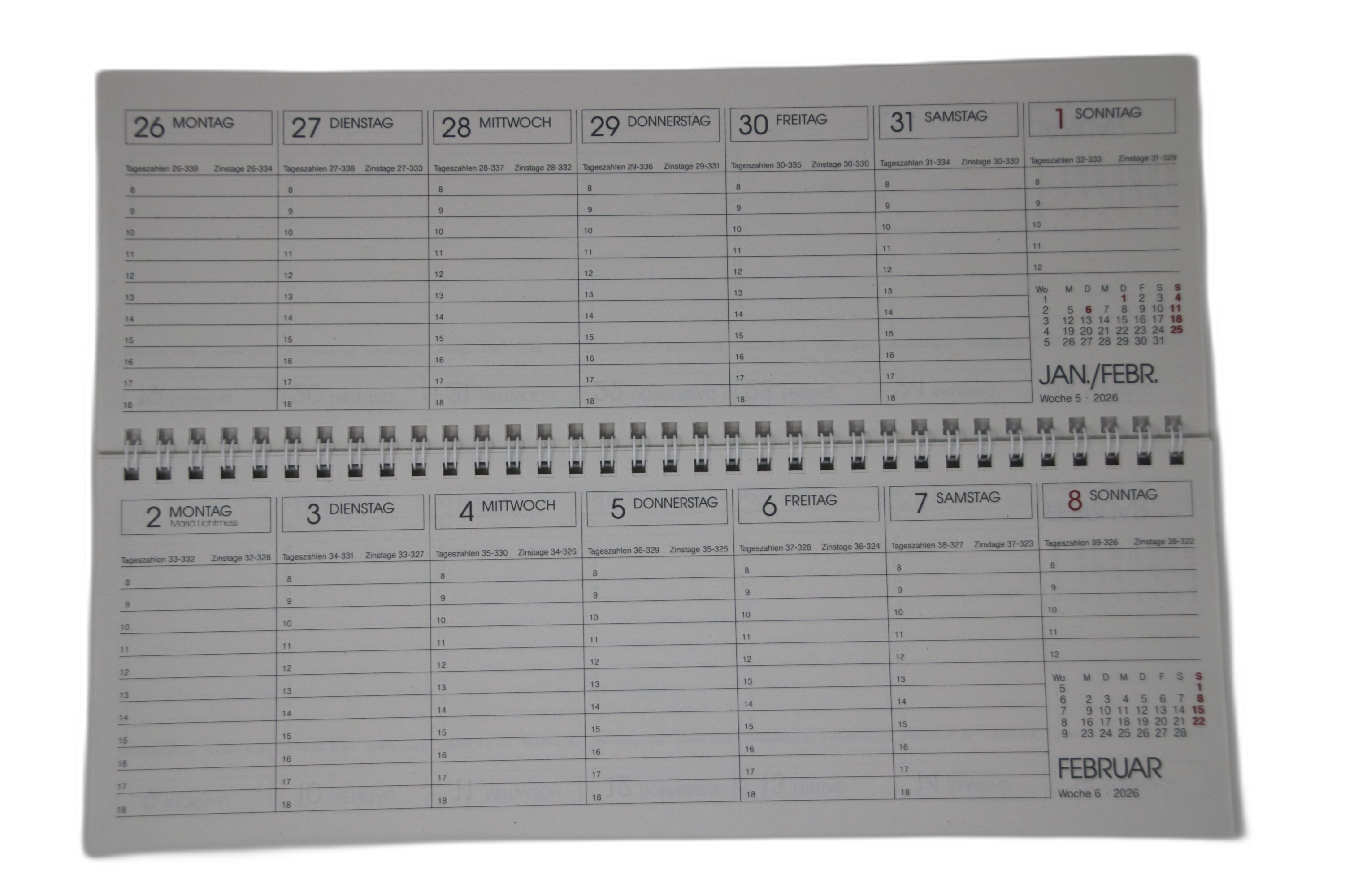 Kalenderaufteilung: | 1 Woche/1 Seite |
