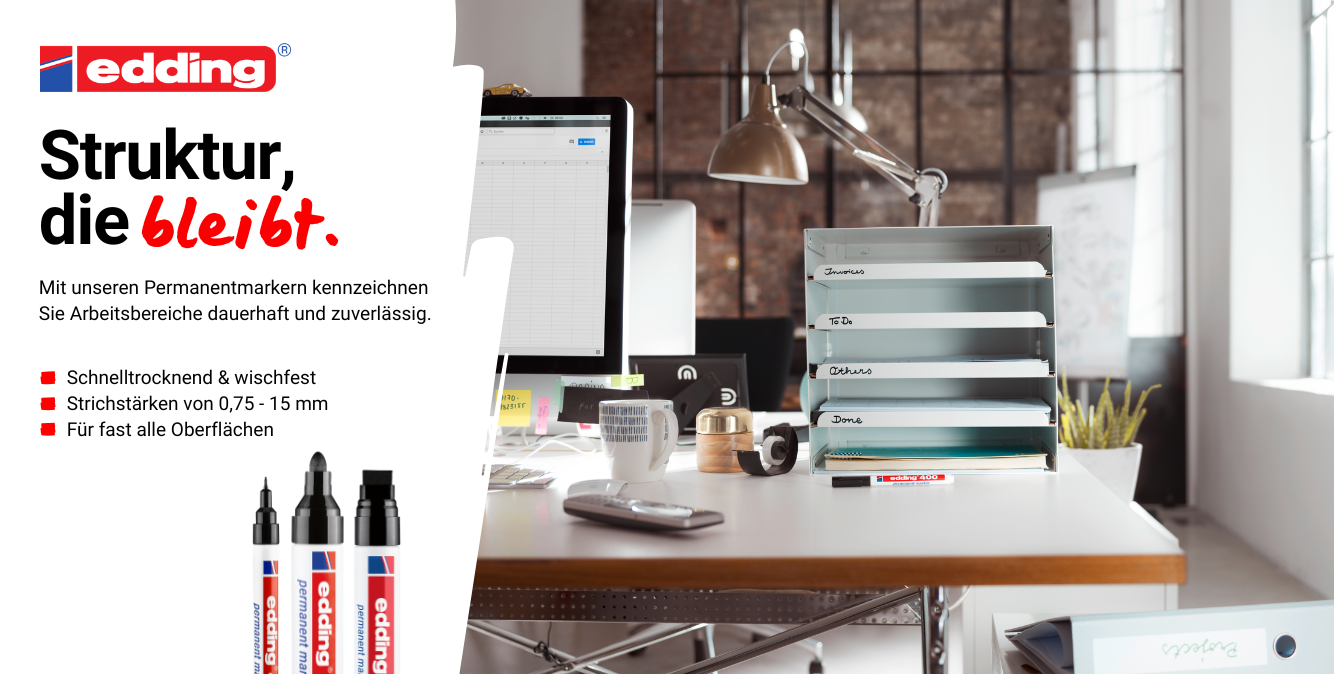 Die edding Permanentmarker sind die zuverlässigen Begleiter, wenn es auf Beständigkeit ankommt. Ob im Büro, Lager, Homeoffice oder in der Werkstatt – sie schreiben kräftig, präzise und wischfest auf nahezu allen Oberflächen. Dank ihrer langlebigen Tinte, der sofortigen Deckkraft und der ergonomischen Form liegen sie perfekt in der Hand und liefern professionelle Ergebnisse, Strich für Strich. edding Permanentmarker: Qualität, die hält, was sie verspricht.