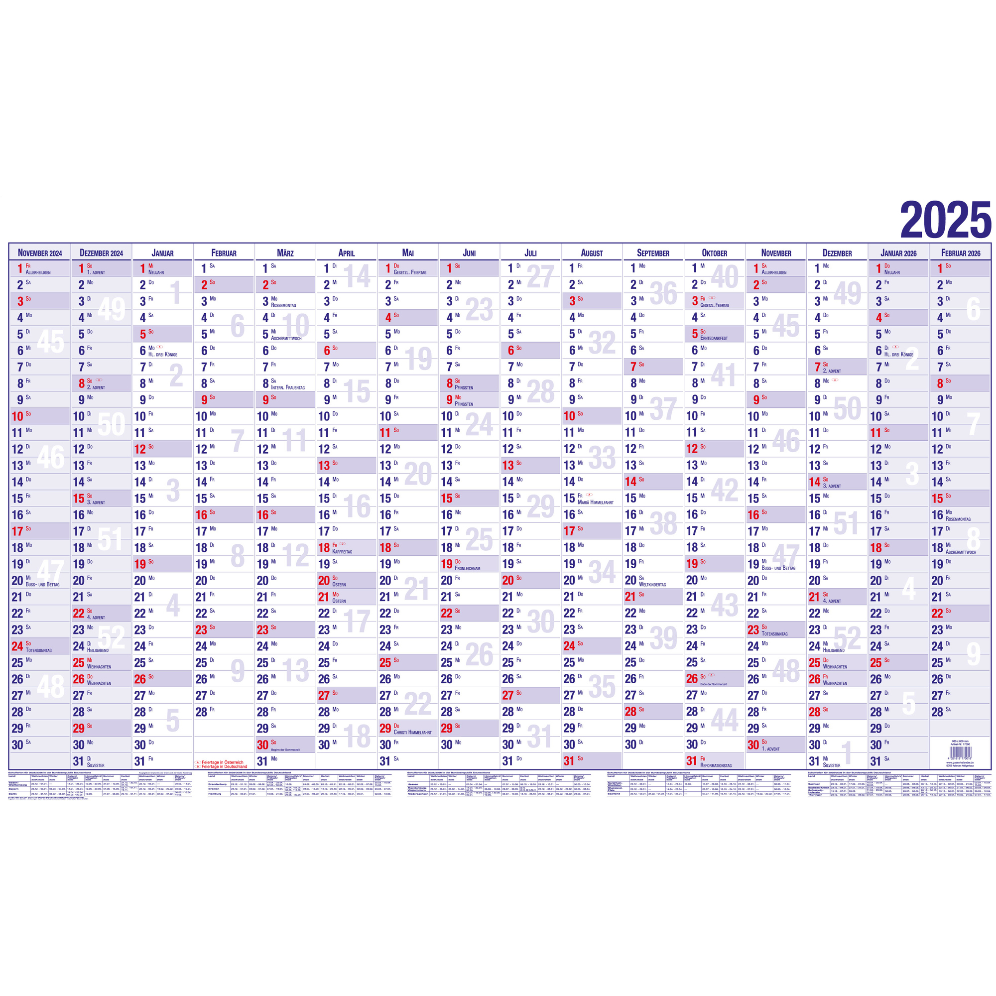 Von November des Vorjahres bis Februar des Folgejahres. Vor- und Folgejahr gerastert. Mit Ferienterminen.